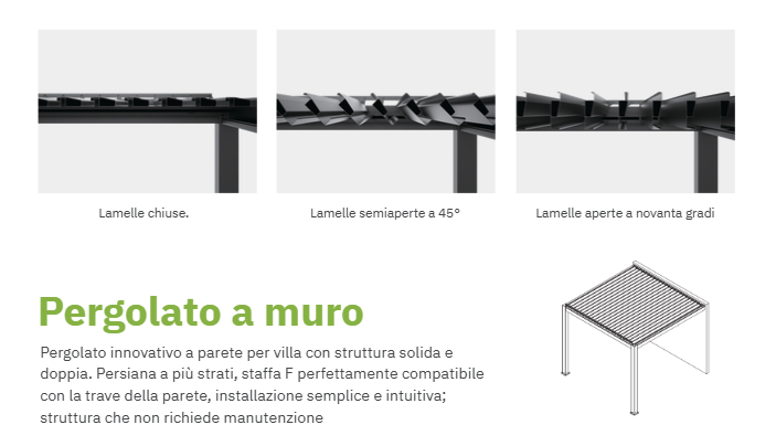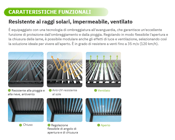 Le lamelle possono essere aperte obliquamente: nelle calde giornate estive, bloccano la luce solare diretta con le lamelle parzialmente aperte a una certa angolazione. Questo impedisce il riscaldamento sotto la pergola e permette all'aria di circolare e rinfrescare piacevolmente l'ambiente esterno.