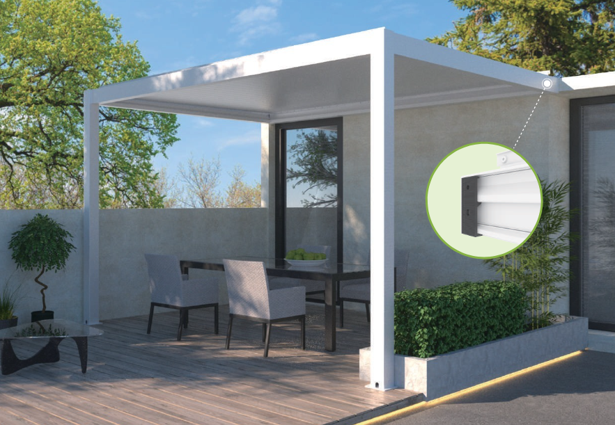 - Una pergola a vostro piacimento: scegliete tra due colori RAL e accessori come luci a LED, tende laterali aggiuntive, ecc.