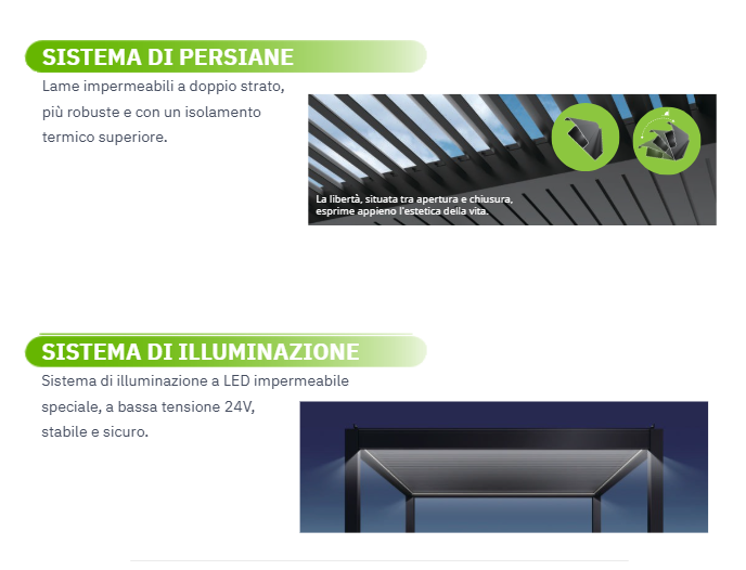 - La pergola bioclimatica NATURA è dotata di una garanzia di 5 anni, mentre tutti gli accessori elettronici sono coperti da una garanzia di 2 anni.